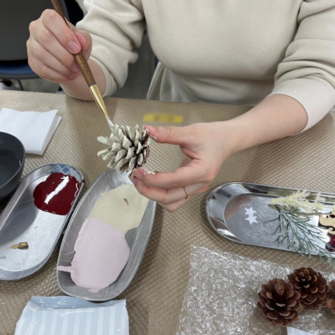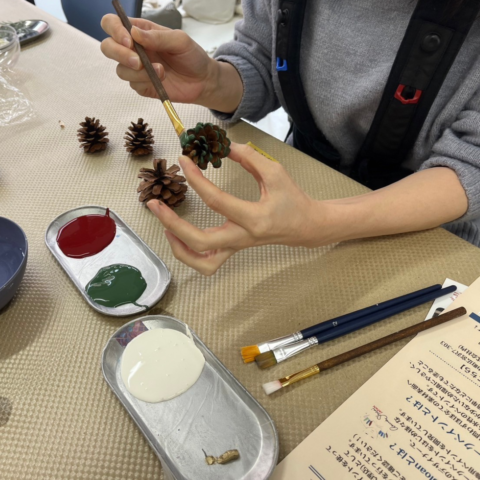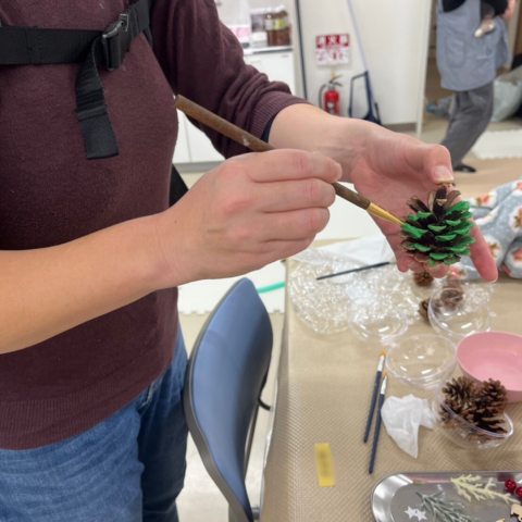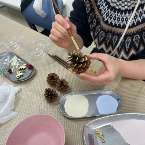 クリスマスシーズンということで、松ぼっくりに色を塗ってオーナメントを作成していただきました。